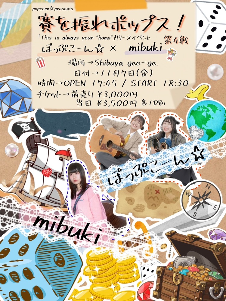 賽を振れポップス!第4戦 SCHEDULE 2025/11/07(Fri) 17:45 - 渋谷gee-ge. 地図を表示 OPEN 17:45/START 18:30 ぽっぷこーん☆は19:25〜 🎫 前売り¥3,000/当日¥3,500 各+1D ミニアルバム「This is always your "home"」 リリースツーマンイベント【賽を振れポップス!】 第4戦は...ぽっぷこーん☆×mibukiさん! チケットご予約はこちらから✨ Copy the URL Report