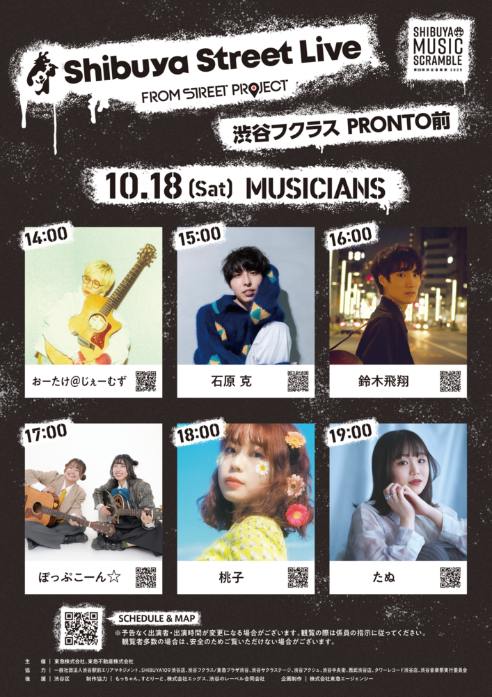 Shibuya Street Live 渋谷フクラスPRONTO前 SCHEDULE 2025/10/18(土) 14:00 - 渋谷フクラス PRONTO前 地図を表示 観覧無料のイベントです! ぽっぷこーん☆は17:00〜 URLをコピーする 報告する