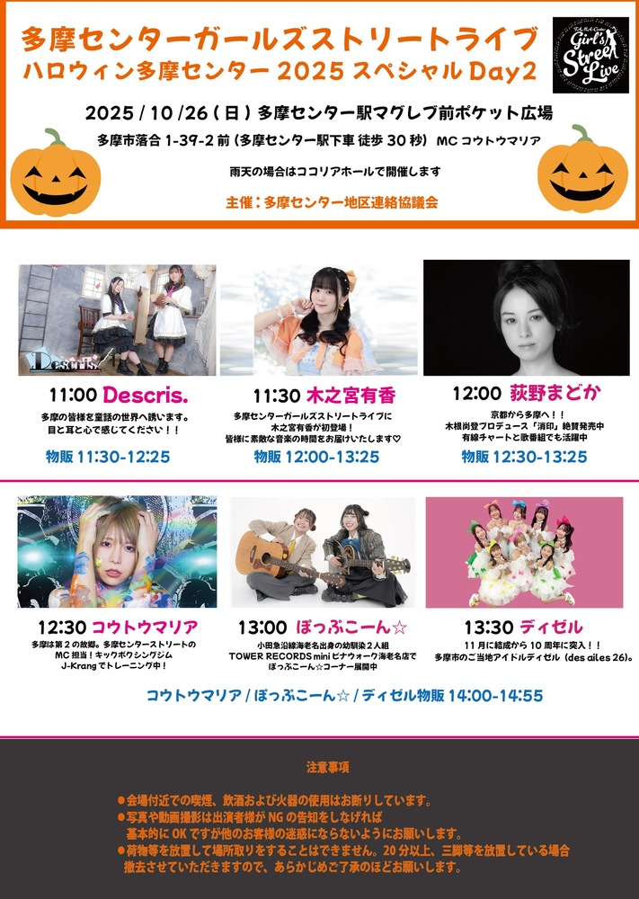 多摩センターガールズストリートライブハロウィン 多摩センター2025スペシャルDay2 SCHEDULE 2025/10/26(日) 11:00 - 多摩センター駅マグレブ前 ポケット広場 地図を表示 観覧無料のイベントです! ぽっぷこーん☆は13:00〜13:25 物販あり⭕️ 悪天候の場合、ココリアホールに会場を変更して開催します! URLをコピーする 報告する