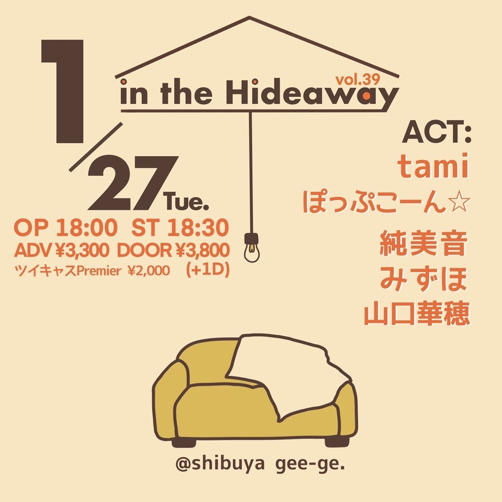 in the Hideaway vol.39 SCHEDULE 2026/01/27(火) 18:00 - Shibuya gee-ge. 地図を表示 OPEN 18:00/START 18:30 ぽっぷこーん☆は19:05〜 🎫前売り¥3,300/当日¥3,800(各+1D)/配信¥2,000 https://premier.twitcasting.tv/shibuyageege/shopcart/407759 チケットご購入はこちらから✨ URLをコピーする 報告する