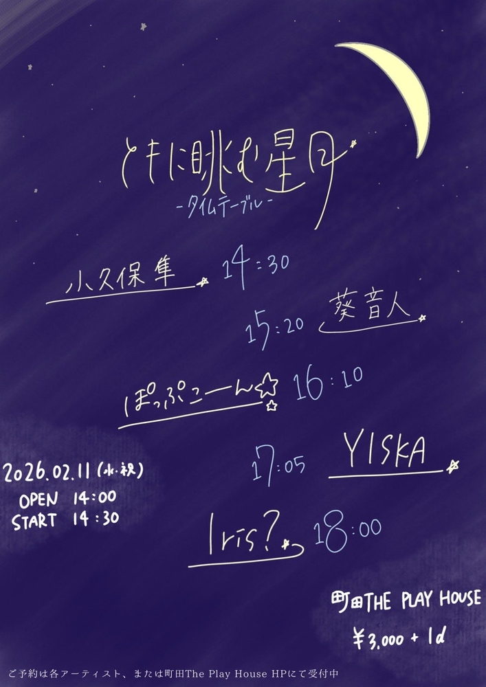 ともに眺む星月 SCHEDULE 2026/02/11(水) 14:00 - 町田The Play House 地図を表示 OPEN 14:00/START 14:30 ぽっぷこーん☆は16:10〜 🎫前売り・当日¥3,000+1D チケットご予約はこちらから✨ URLをコピーする 報告する