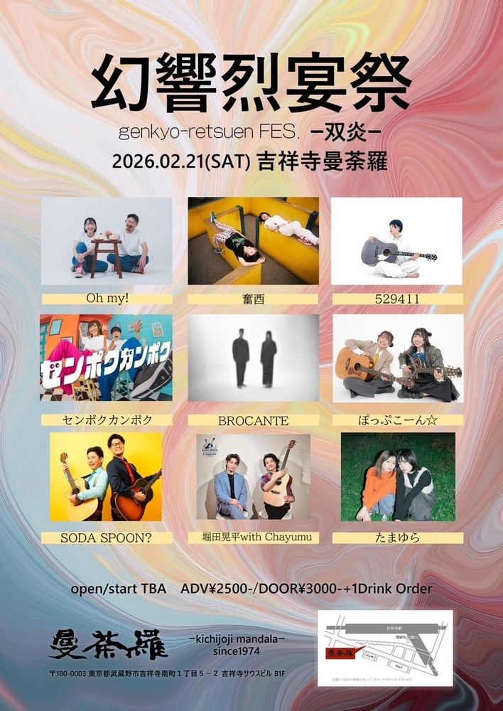 『幻響烈宴祭-双炎-2026』 SCHEDULE 2026/02/21(土) 15:30 - 吉祥寺曼荼羅 地図を表示 OPEN 15:30/START 16:00 ぽっぷこーん☆は16:00から! 🎫前売り¥2,500/当日¥3,000(各+1D) チケットご予約はこちらから✨ URLをコピーする 報告する