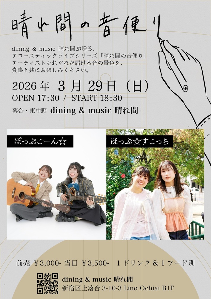 晴れ間の音便り SCHEDULE 2026/03/29(日) dining &music 晴れ間 地図を表示 OPEN 17:30/START 18:30 ぽっぷこーん☆は18:30〜 🎫前売り¥3,000/当日¥3,500(1D&1フード別) ほっぷ☆すこっちさんとのツーマンイベントです‼︎ ※座席に限りがあるため、お早めにお取り置きをお願いいたします。 チケットご予約はこちらから✨ URLをコピーする 報告する