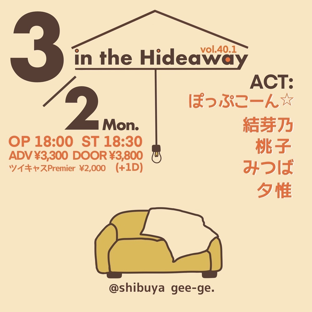 in the Hideaway vol.40.1 SCHEDULE 2026/03/02(月) 18:00 - Shibuya gee-ge. 地図を表示 OPEN 18:00/START 18:30 ぽっぷこーん☆は20:50〜トリ! 🎫前売り¥3,300/当日¥3,800(+1D)/配信¥2,000 https://premier.twitcasting.tv/shibuyageege/shopcart/419105 チケットはこちらから✨ URLをコピーする 報告する