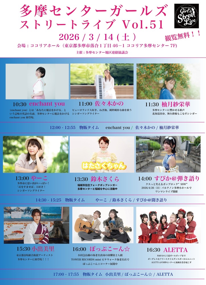 多摩センターガールズストリートライブ Vol.51 SCHEDULE 2026/03/14(土) 16:00 - 多摩センター ココリアホール 地図を表示 ぽっぷこーん☆は16:00〜 観覧無料のイベントです! 17:00-17:55 物販あり🙆🏻♀️ URLをコピーする 報告する