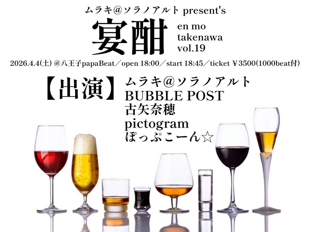 ムラキ@ソラノアルトpresent's 宴酣 vol.19 SCHEDULE 2026/04/04(土) 18:00 - 八王子papaBeat 地図を表示 OPEN 18:00/START 18:45 ぽっぷこーん☆は18:45〜 🎫前売り・当日¥3,500(+1オーダー券¥1,000) ご予約はこちらから✨ URLをコピーする 報告する