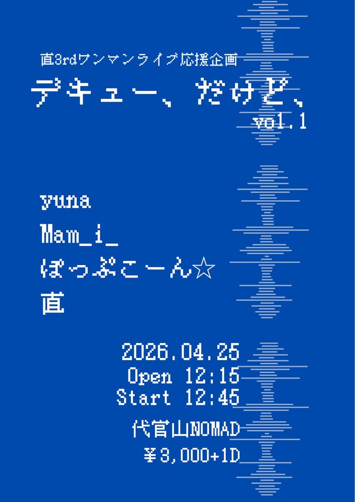 直ワンマン応援企画 「デキュー、だけど、」vol.1 SCHEDULE 2026/04/25(土) 12:15 - 代官山NOMAD 地図を表示 OPEN 12:15/START 12:45 ぽっぷこーん☆は12:45〜トップバッターです! 🎫前売り・当日¥3,000(+1D¥700) チケットご予約はこちらから✨ URLをコピーする 報告する