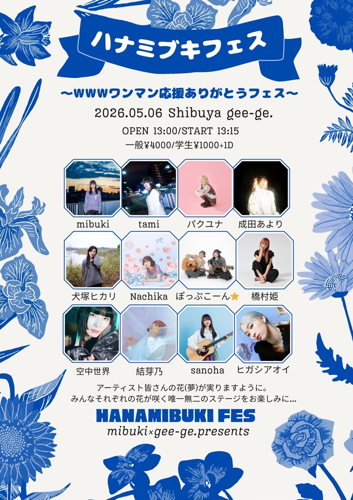 Shibuya gee-ge. mibuki×gee-ge. presents. 「ハナミブキフェス」 〜WWWワンマン応援ありがとうフェス〜 SCHEDULE 2026/05/06(水) 13:00 - Shibuya gee-ge. 地図を表示 OPEN 13:00/START 13:15 🎫一般¥4,000/学生¥1,000(各+1D) チケットご予約はこちらから✨ URLをコピーする 報告する