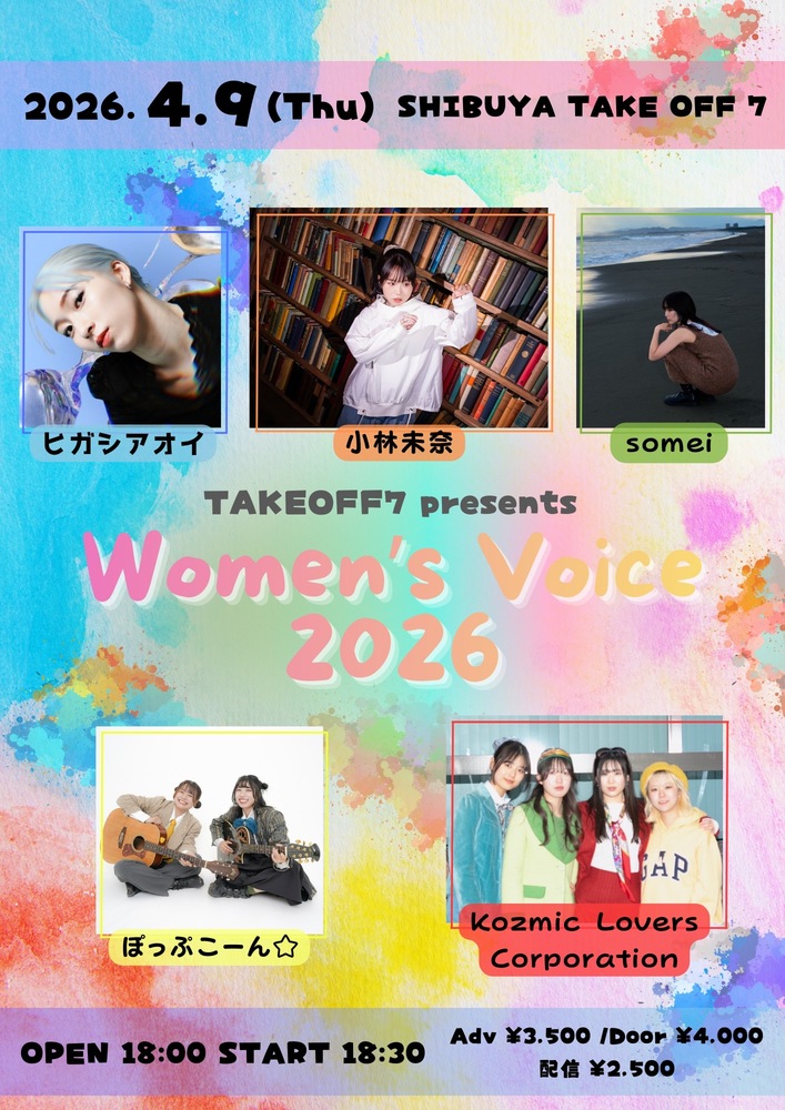 TAKE OFF 7 presents Women’s Voice 2026 SCHEDULE 2026/04/09(木) 18:00 - SHIBUYA TAKE OFF 7 地図を表示 OPEN 18:30/START 18:30 ぽっぷこーん☆は19:10〜 🎫 前売¥3,500円/当日¥4,000(各+1D)/ 配信¥2,500 https://premier.twitcasting.tv/shibuyatakeoff7/shopcart/423303 ご予約はこちらから✨ URLをコピーする 報告する