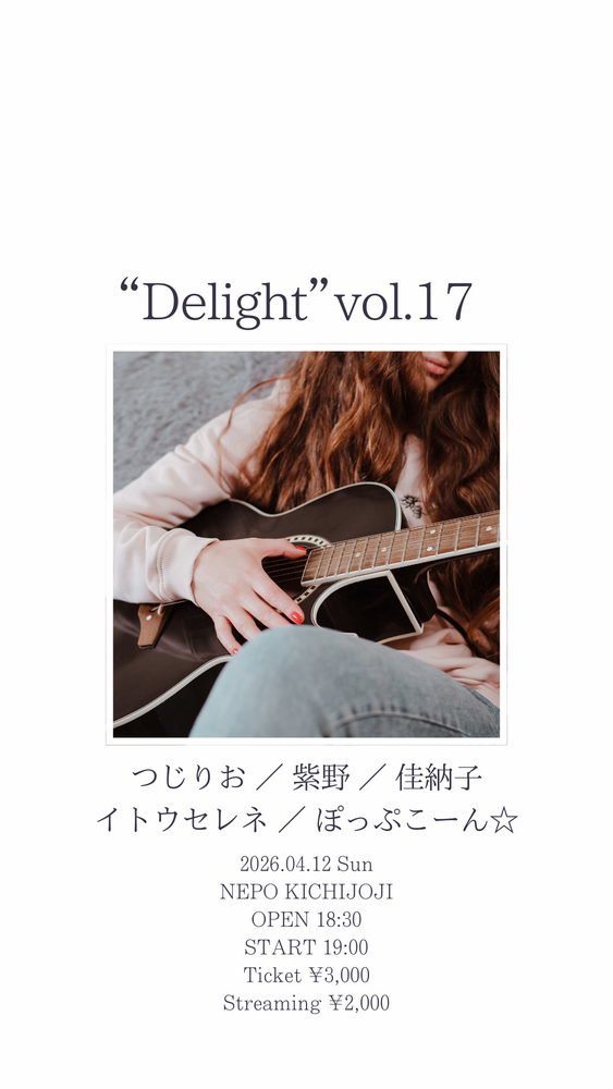 "Delight" vol.17 SCHEDULE 2026/04/12(日) 18:30 - 吉祥寺NEPO 地図を表示 OPEN 18:30/START 19:00 ぽっぷこーん☆は19:00〜 🎫前売り・当日¥3,000(+1オーダー)/配信¥2,000 https://nepo.co.jp/schedules/view/3349 配信チケットはこちらから✨ URLをコピーする 報告する